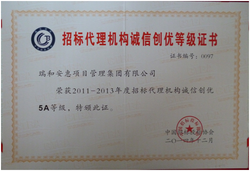 2011-2013年度招標代理機構(gòu)誠信創(chuàng)優(yōu)5A等級證書