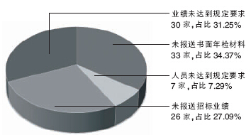 相關(guān)文件顯示,這96家機(jī)構(gòu)年檢不合格的主要問題為:未報(bào)送書面年檢材料(33家)、報(bào)送的招標(biāo)從業(yè)人員經(jīng)審查未達(dá)到規(guī)定要求(7家)、未報(bào)送招標(biāo)業(yè)績(26家)、報(bào)送的招標(biāo)業(yè)績經(jīng)審查未達(dá)到規(guī)定要求(30家)。其中,未報(bào)送招標(biāo)業(yè)績?yōu)榻衲晷略鰡栴}。