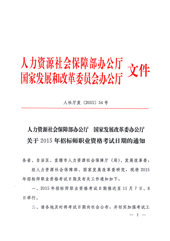 4月13日,人力資源社會保障部辦公廳、國家發(fā)展改革委辦公廳下發(fā)《關于2015年招標師職業(yè)資格考試日期的通知》(人社廳發(fā)[2015]54號),將首次招標師職業(yè)資格考試日期推遲至11月7日-8日舉行。請廣大考生注意時間調整,提前做好考前準備。