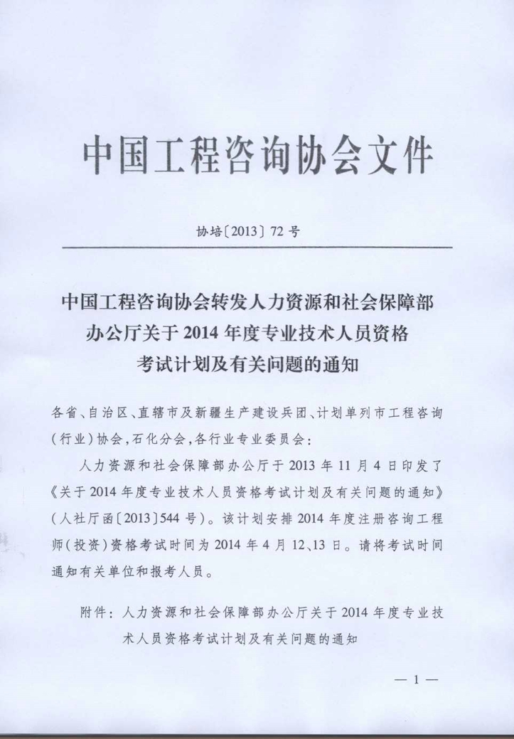 中國(guó)工程咨詢協(xié)會(huì)轉(zhuǎn)發(fā)人力資源和社會(huì)保障部辦公廳關(guān)于2014年度專業(yè)技術(shù)人員資格考試計(jì)劃及有關(guān)問題的通知