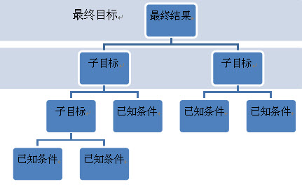 其實(shí)這種倒推的方法大家并不陌生,項(xiàng)目管理本身就是從目標(biāo)出發(fā)的,這一點(diǎn)從“項(xiàng)目”的定義就可以看出,“為了實(shí)現(xiàn)特定的目標(biāo)而采取的一系列行動”,所有的行動都是目標(biāo)導(dǎo)向的。例如在進(jìn)行范圍分析、編寫WBS的過程中,就是采用的自頂向下的分解、倒推的方法。同樣,在倒推尋找充分條件的過程中,我們也可以采用類似的方式,從目標(biāo)出發(fā),逐步分析、分解充分條件: