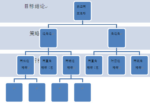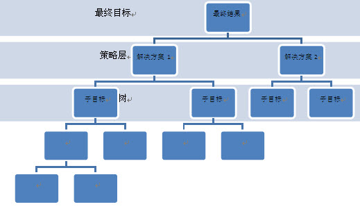 在這樣一個分析結(jié)構(gòu)當(dāng)中,經(jīng)過實(shí)踐發(fā)現(xiàn),第一步應(yīng)該增加一個層次,提供不同策略的選擇分支,然后才是不同策略下所需要的充分條件。這種方式的好處在于,當(dāng)存在不同的可選解決方案時,這種分析方法對于決策能提供很好的支持。同時,在以后項(xiàng)目實(shí)施過程中如果條件發(fā)生了變化,還可能利用當(dāng)時已有的條件,通過另外分支中的解決方案來實(shí)現(xiàn)目標(biāo)。