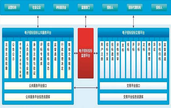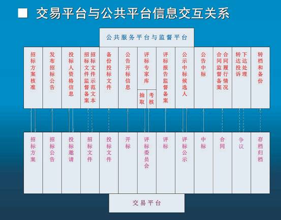 交易平臺是以數(shù)據(jù)電文形式完成招標投標交易活動的信息平臺。公共服務平臺是滿足交易平臺之間信息交換、資源共享需要,并為市場主體、行政監(jiān)督部門和社會公眾提供信息服務的平臺。行政監(jiān)督平臺是行政監(jiān)督部門和監(jiān)察機關在線監(jiān)督電子招標投標活動的信息平臺。