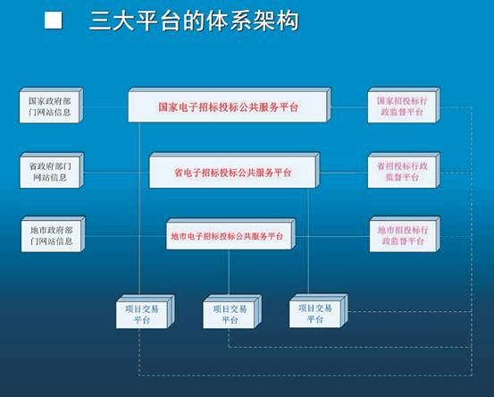根據(jù)我國目前招標投標行政監(jiān)督體制,全國電子招標投標信息公共服務平臺體系共有國家、省、市三個層級的平臺構成,其主要服務功能:
