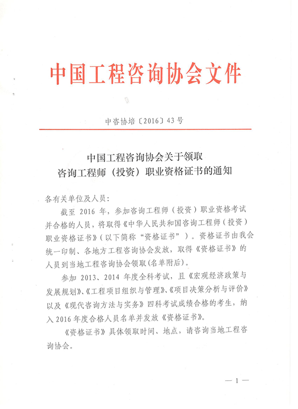 中國工程咨詢協(xié)會關于領取咨詢工程師(投資)職業(yè)資格證書的通知