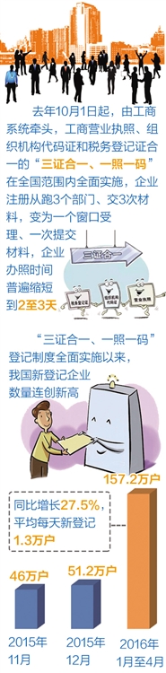 我國自2014年起積極推進商事制度改革,降低市場準入門檻,特別是去年10月1日起,由工商系統(tǒng)牽頭,工商營業(yè)執(zhí)照、組織機構代碼證和稅務登記證合一的“三證合一、一照一碼”在全國范圍內全面實施,企業(yè)注冊從跑3個部門、交3次材料,變?yōu)橐粋€窗口受理、一次提交材料,企業(yè)辦照時間普遍縮短到2至3天,有些地方甚至15分鐘出證,立等可取。