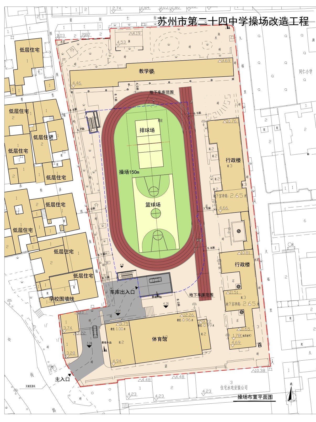 蘇州市第二十四中學校操場及塑膠跑道已破舊脫殼,校內路面風化嚴重,現決定對操場進行整體改造。由于校內場地狹小車輛無處停放,擠占了學生活動空間,給學生、教師的通行帶來不便且存在一定的交通安全隱患。為保證學校教育教學需要,保障師生交通安全,改善辦學條件,同時不占用校外道路有限的停車資源,學校決定建設一層地下停車庫。項目建筑占地面積2347平方米,總建筑面積2401平方米,地下建筑面積2347平方米,地上建筑面積54平方米,停車位約64個。項目總投資約3000萬元。項目建設期為1年。