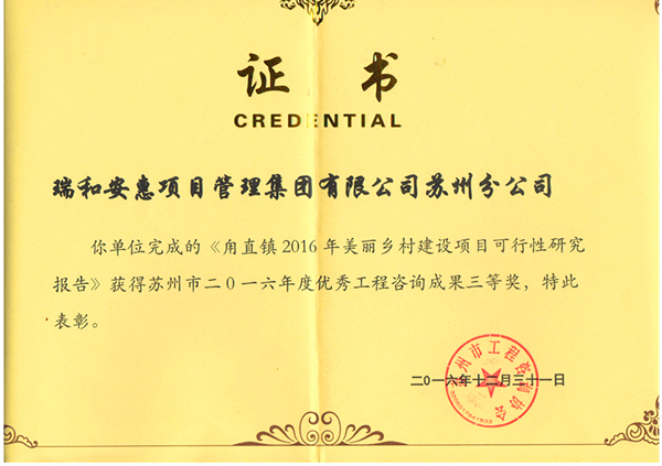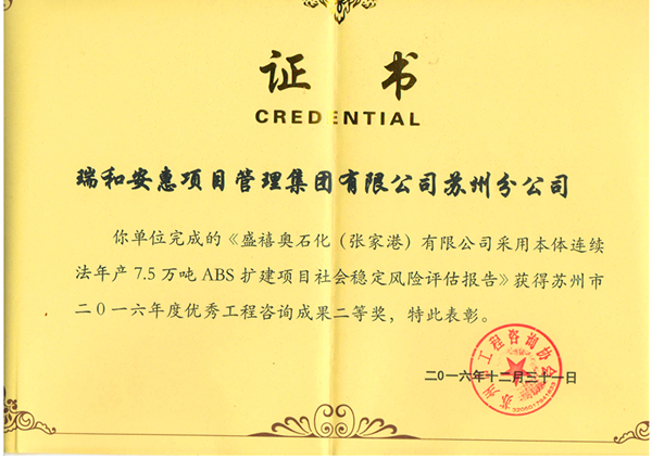 公司完成的《盛禧奧石化(張家港)有限公司采用本體連接法年產(chǎn)7.5萬噸ABS擴建項目社會穩(wěn)定風險評估報告》及《甪直鎮(zhèn)2016年美麗鄉(xiāng)村建設項目可行性研究報告》分別榮獲蘇州市二零一六年度優(yōu)秀工程咨詢成果二等獎、三等獎。