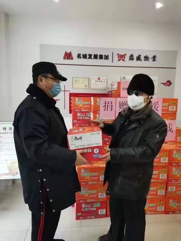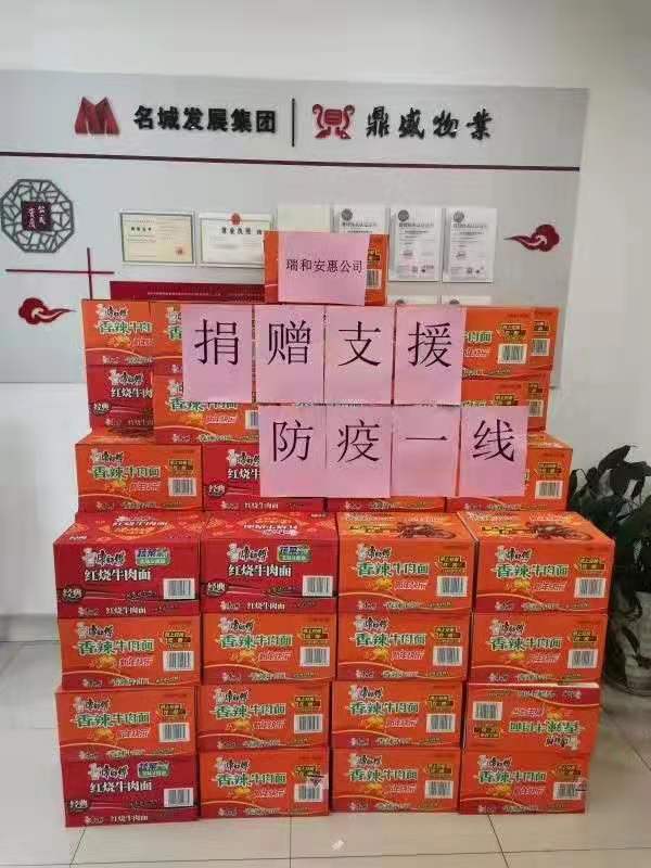 2020年2月7日,瑞和安惠蘇州分公司黨支部書記、總經(jīng)理王燕鳴代表公司向戰(zhàn)斗在抗疫戰(zhàn)斗第一線的鼎盛物業(yè)管理人員捐贈300箱方便面,感謝他們在寒風(fēng)冷水中守護(hù)一方平安。
