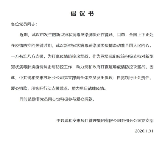 為踐行企業(yè)社會責任,用實際行動助力疫情防控。1月31日,中共瑞和安惠項目管理集團有限公司蘇州分公司黨支部發(fā)出倡議書,發(fā)動公司黨員及員工向疫區(qū)捐獻善款,籌得愛心捐款29400元。